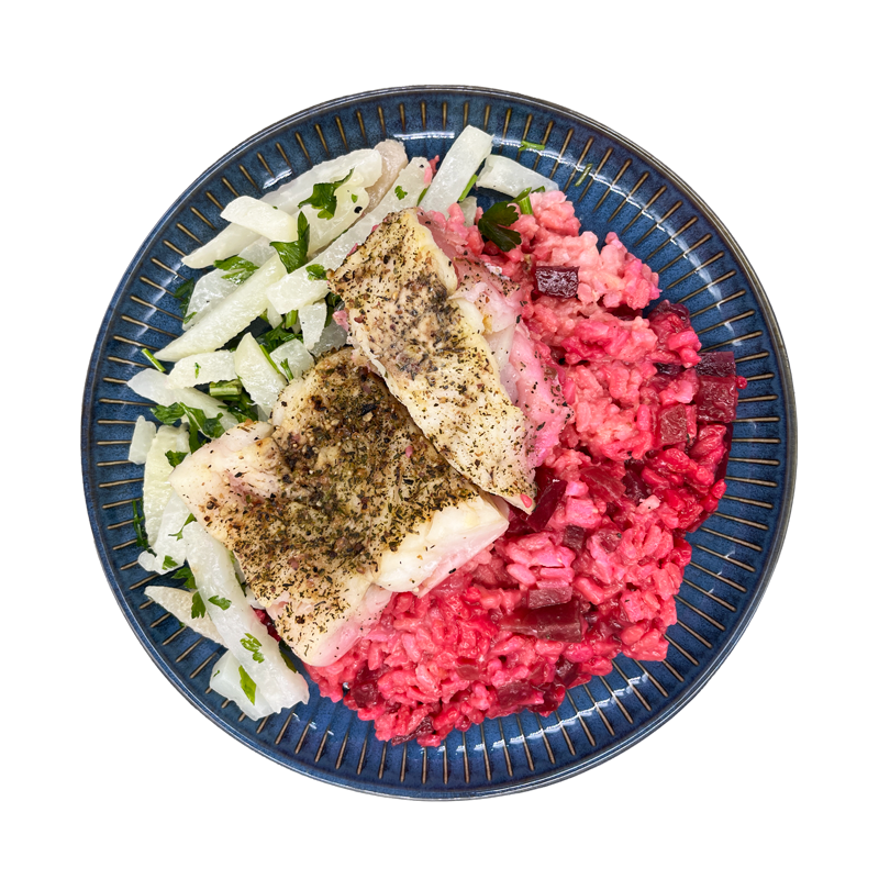 Miruna z pieca na buraczanym risotto, kalarepa z ziołami