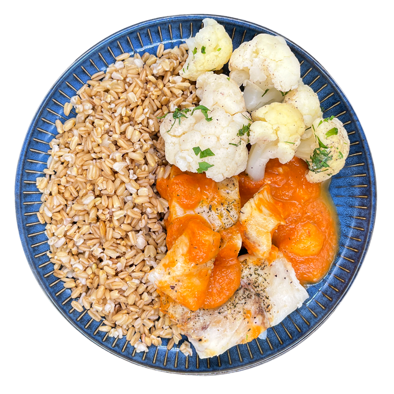 Miruna z pieca, kalafior z ziołami, kasza owsiana
