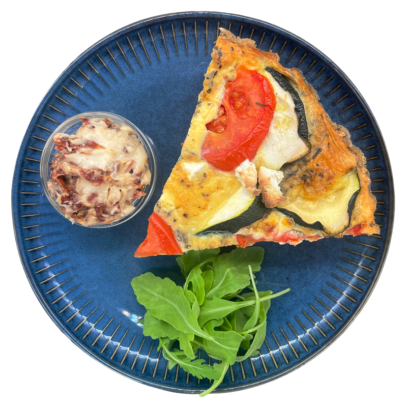 Francuski quiche z mąki gryczanej z pomidorem, szpinakiem i fetą, pasta aioli z suszonymi pomidorami
