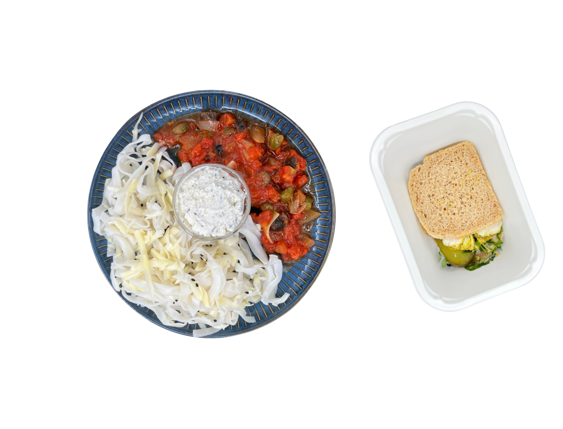 Twarożek z suszonymi pomidorami, mix sałat z zielonym ogórkiem, masło, chleb pszenno – żytni