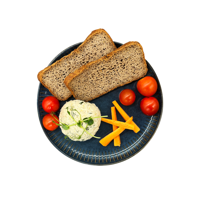 Jajecznica z 2 jaj na łyżeczce masła z kromką chleba razowego.